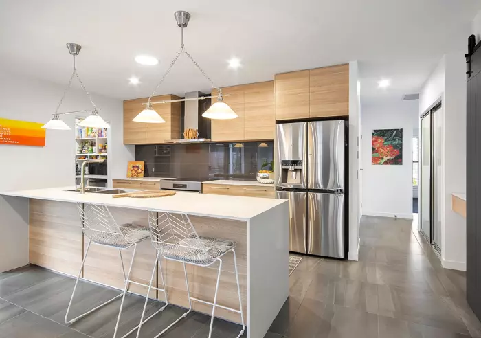 stone bench tops, oversized breakfast bar, new dishwasher, stainless steel appliances