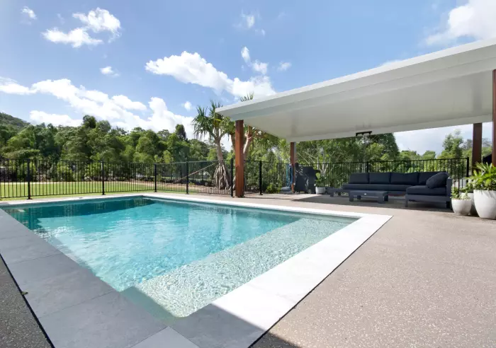 7) Large sparkling in-ground concrete swimming pool, 8m x 7m, long spa seat, seamless glass fencing