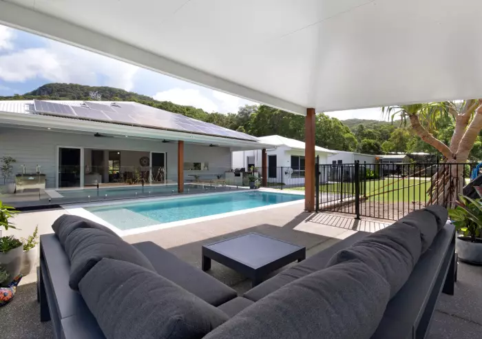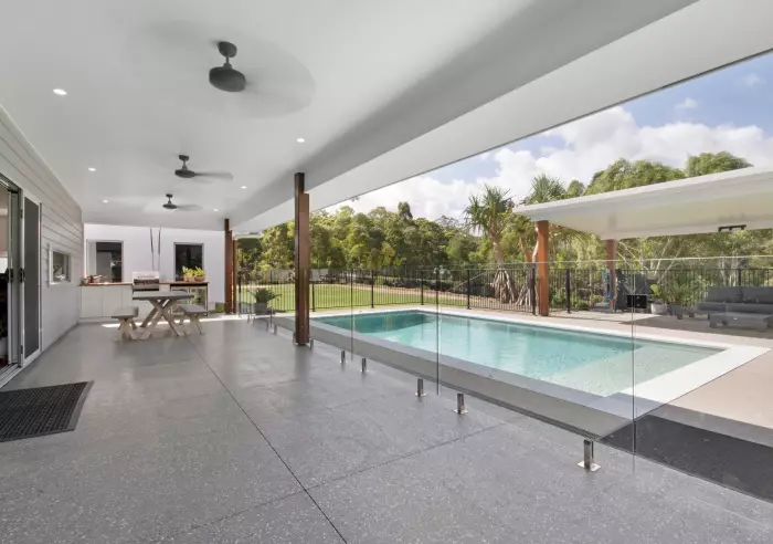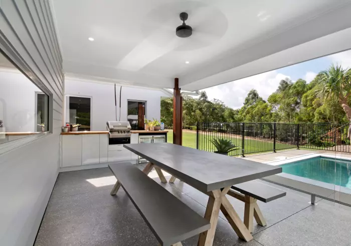 6) Outdoor attached Entertainment area under main roof this adjoins open plan living and sits overlooking the pool area with built-in kitchenette bench, BBQ and bar fridge for entertaining