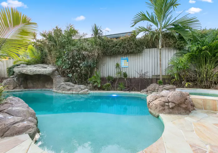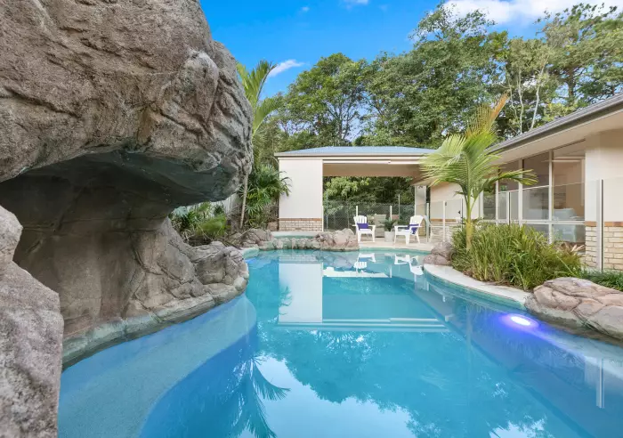 * Picturesque impressive pool and spa, surrounding landscaped gardens, . The pool has a surreal waterfall rock formations built by same builder as Polar World at Sea World includes solid bench type seat inside for kids fun and guests to enjoy all summer long