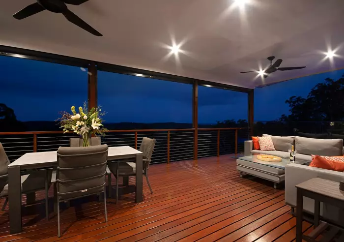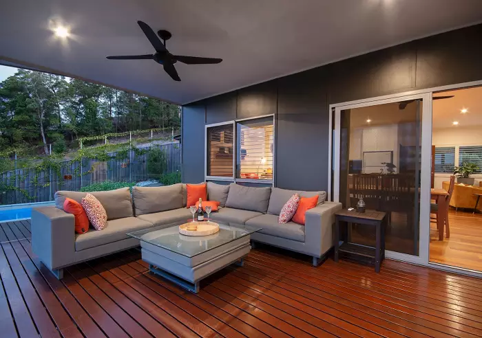 * Entertainment area, large seated front verandah under main roof, entry patio area at front door