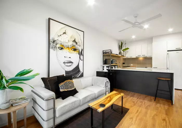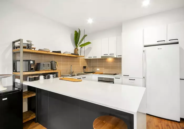 - Trendy kitchen with urban styling, waterfall stone bench top & fridge tap