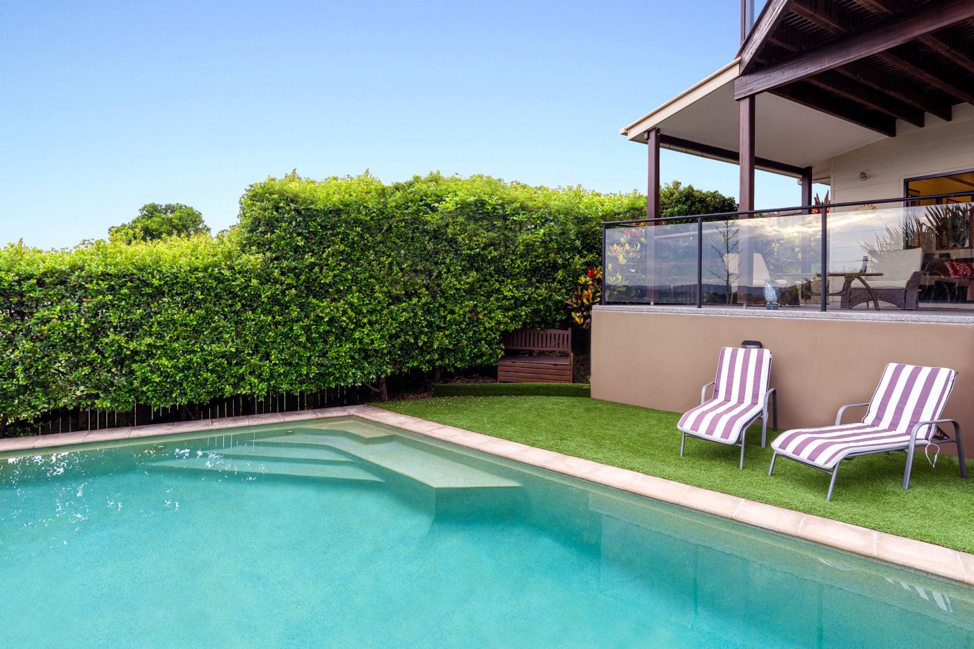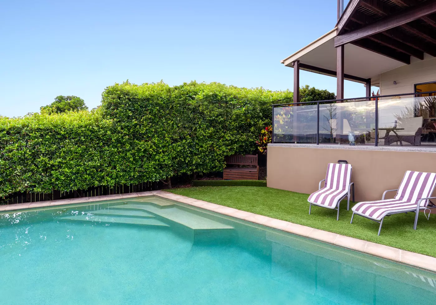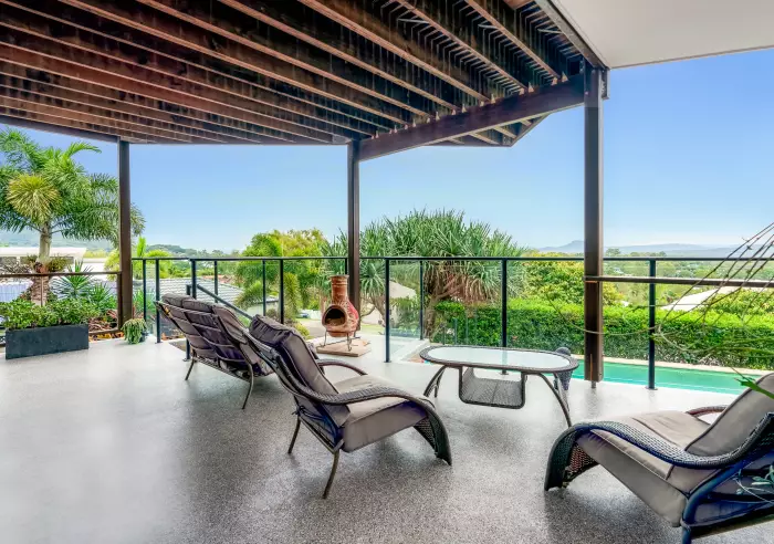 * Large balcony over pool with astroturf sitting area for lounging by the pool, overlooking the hinterland views on a hot summer's day