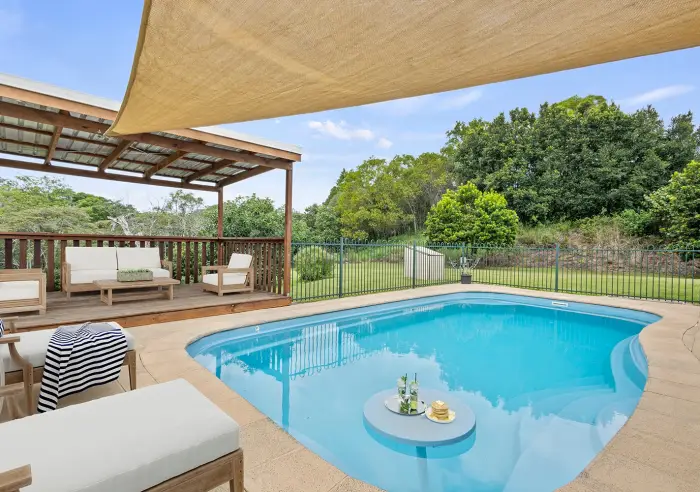 Outdoor living takes centre stage at Lilly Pilly's. A large in-ground swimming pool sits beside an entertaining deck, creating the perfect setting for summer gatherings, family celebrations, or quiet afternoons enjoying the natural beauty of the property.